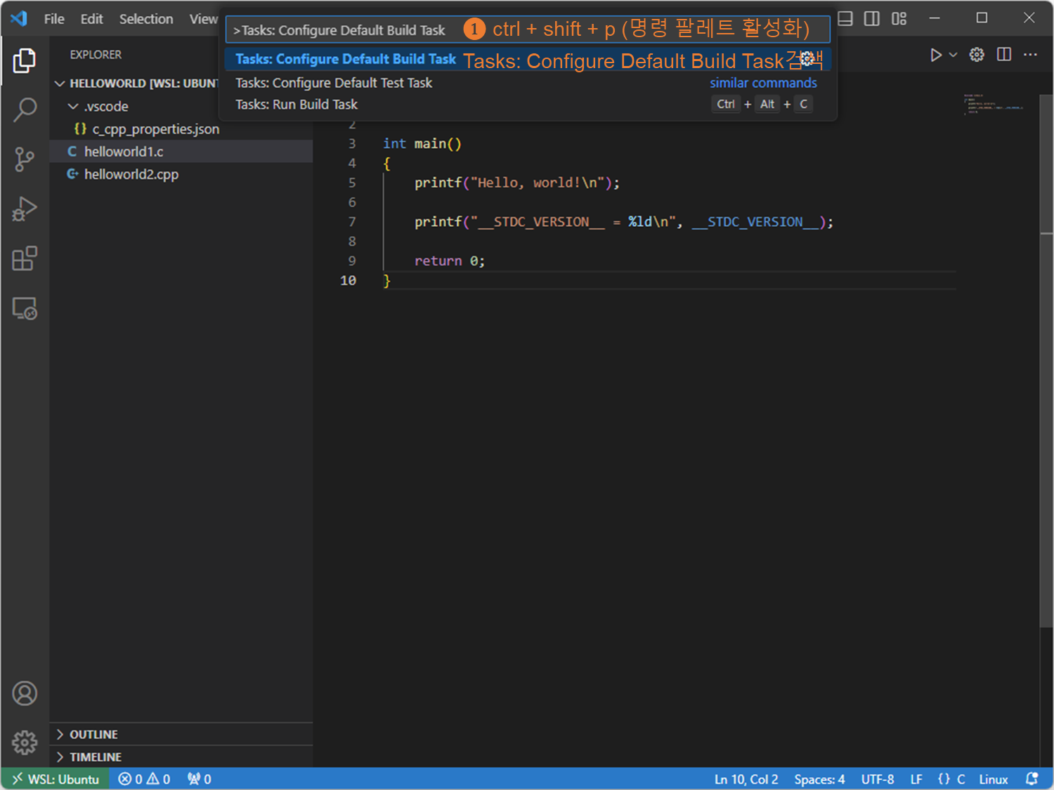 tasks.json 파일이 없다면, Ctrl + Shift + P → Tasks: Configure Default Build Task 입력 후 선택합니다.