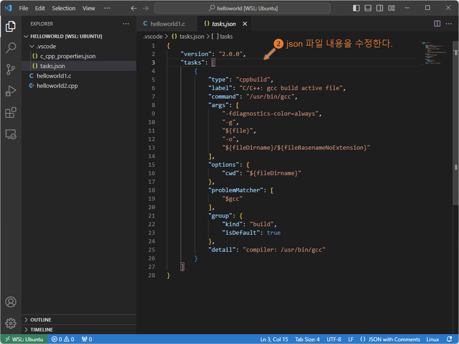 이전 단계에서 테스트 코드를 빌드 했다면, 아래처럼 tasks.json 파일이 기본값으로 생성됩니다.