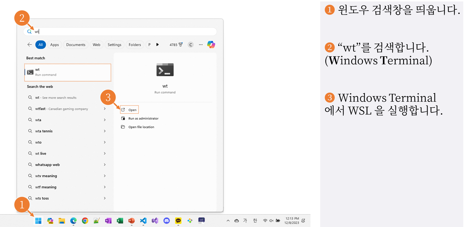 [WSL 공식문서], [WSL 개발 환경 설정]Step1. 윈도우에서 WSL 활성화더보기Window + S 단축키를 누르면, 검색 기능이 활성화 됩니다.서검색어로 키워드 입력하면 검색된 를 실행합니다., 체크 ✔ 하여 활