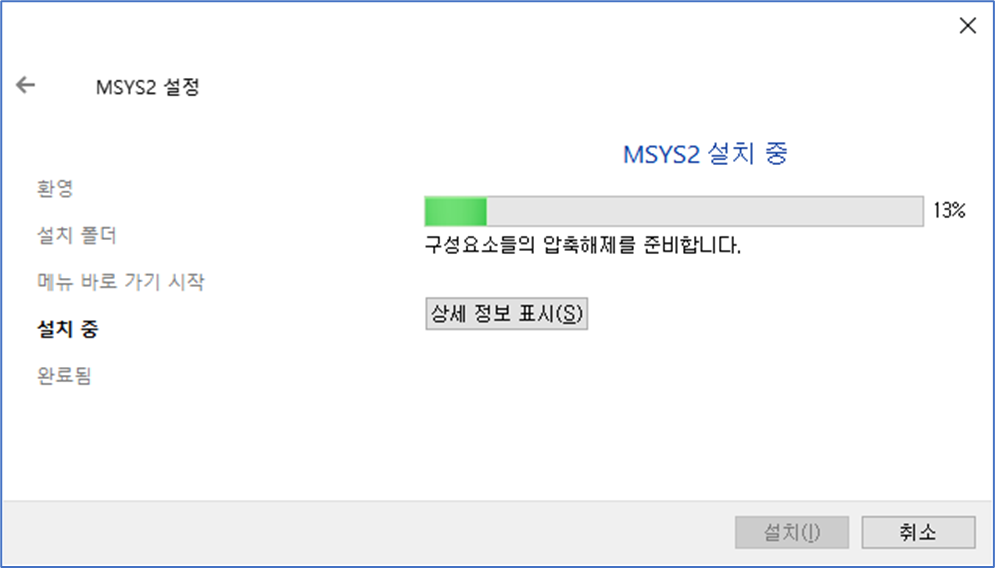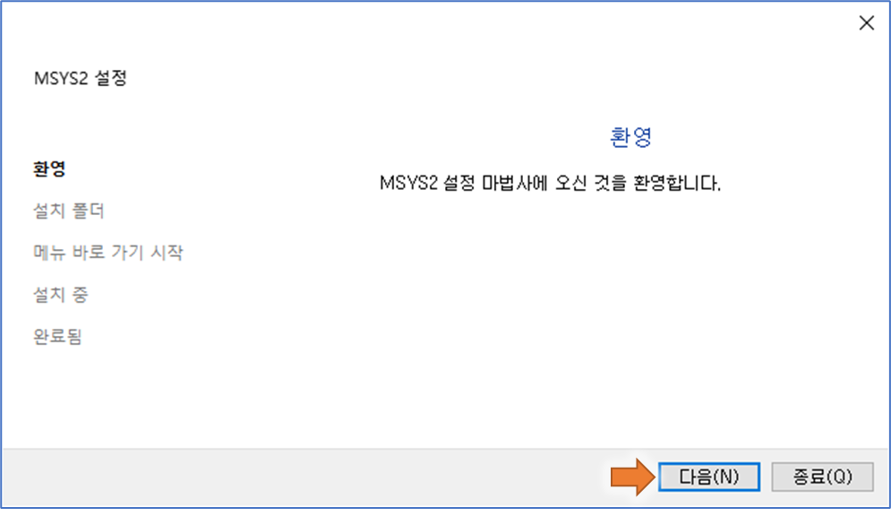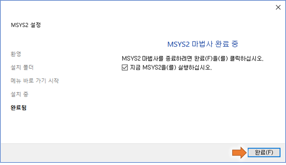 03. 완료를 누르면, C:\msys64\ucrt64.exe 프로그램이 자동 실행됩니다.