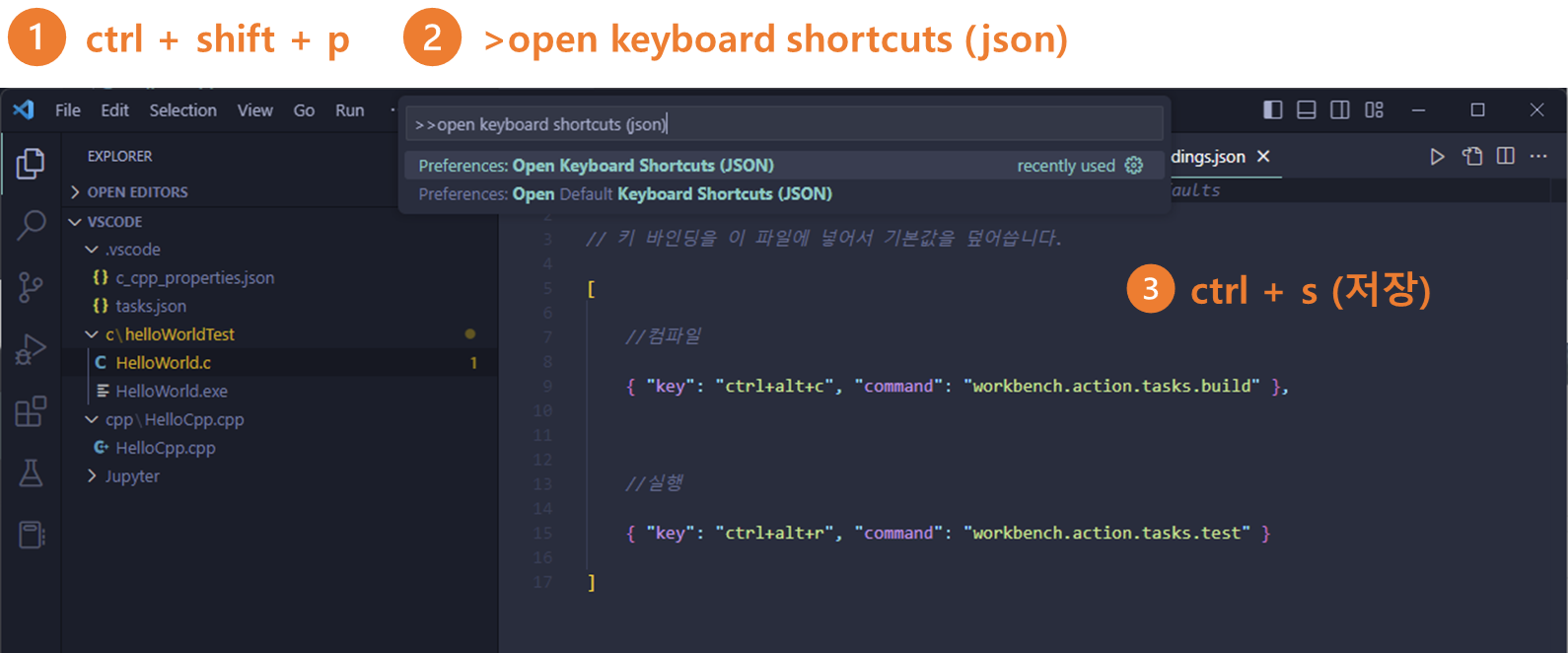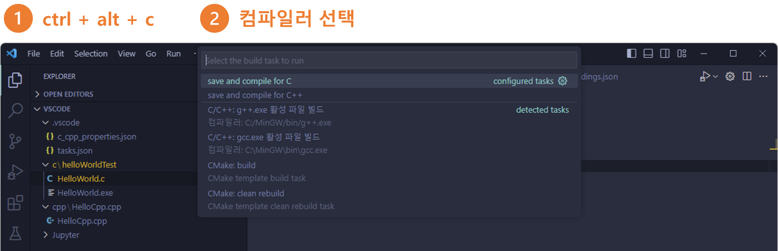 만약 tasks.json 파일이 없다면, Ctrl + Shift + P → Tasks: Configure Default Build Task 메뉴를 선택합니다.