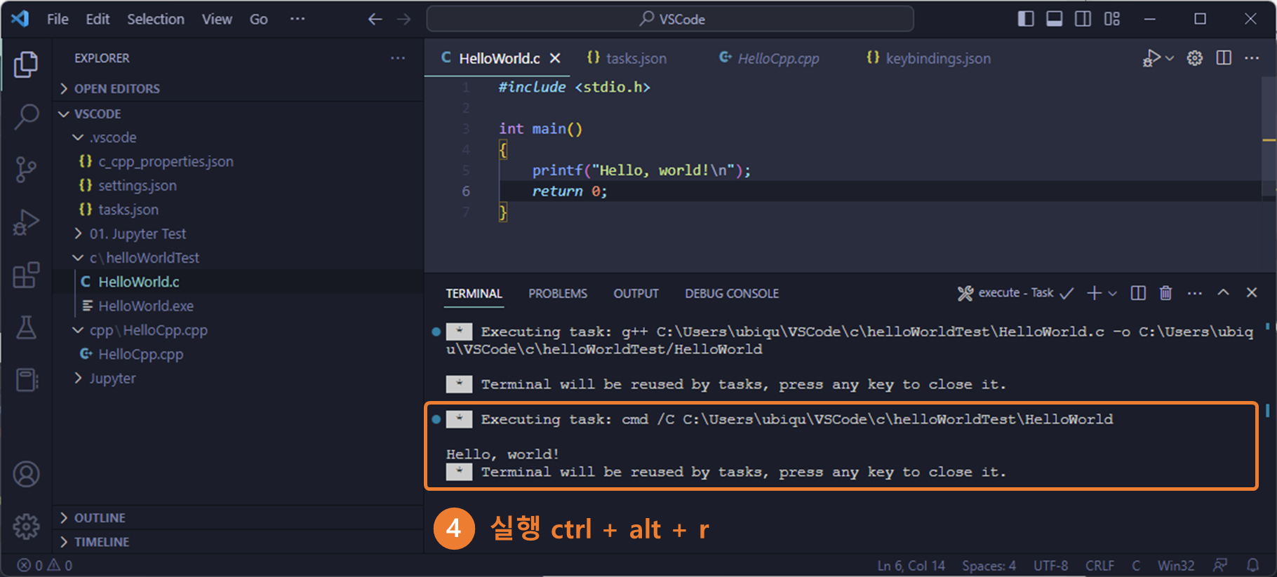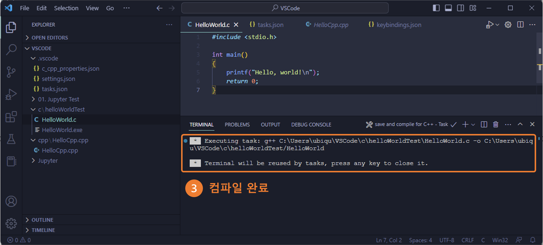 VS Code 상단 메뉴의 의 터미널 > 빌드 를 클릭해 실행하시거나