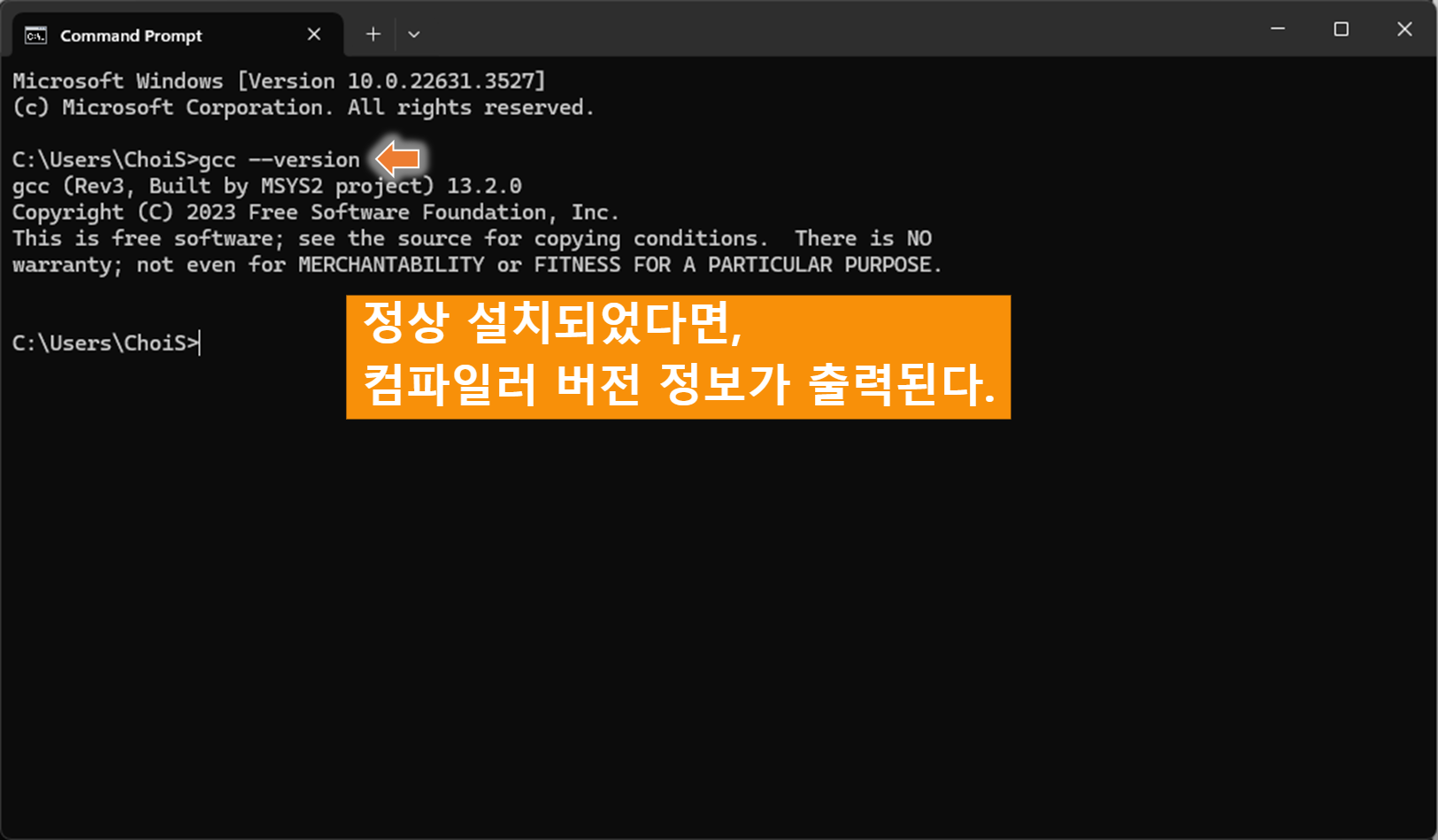 MinGW-w64 컴파일러 설치와 설정이 완료되었습니다.