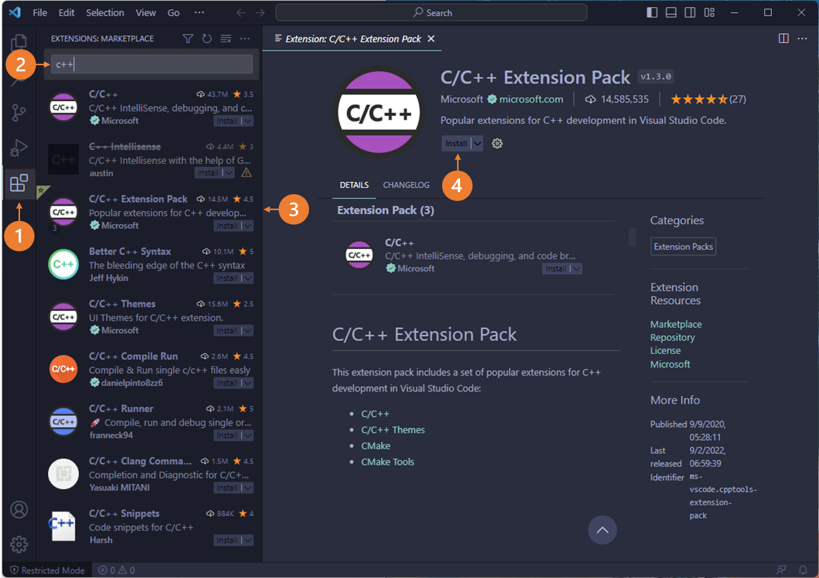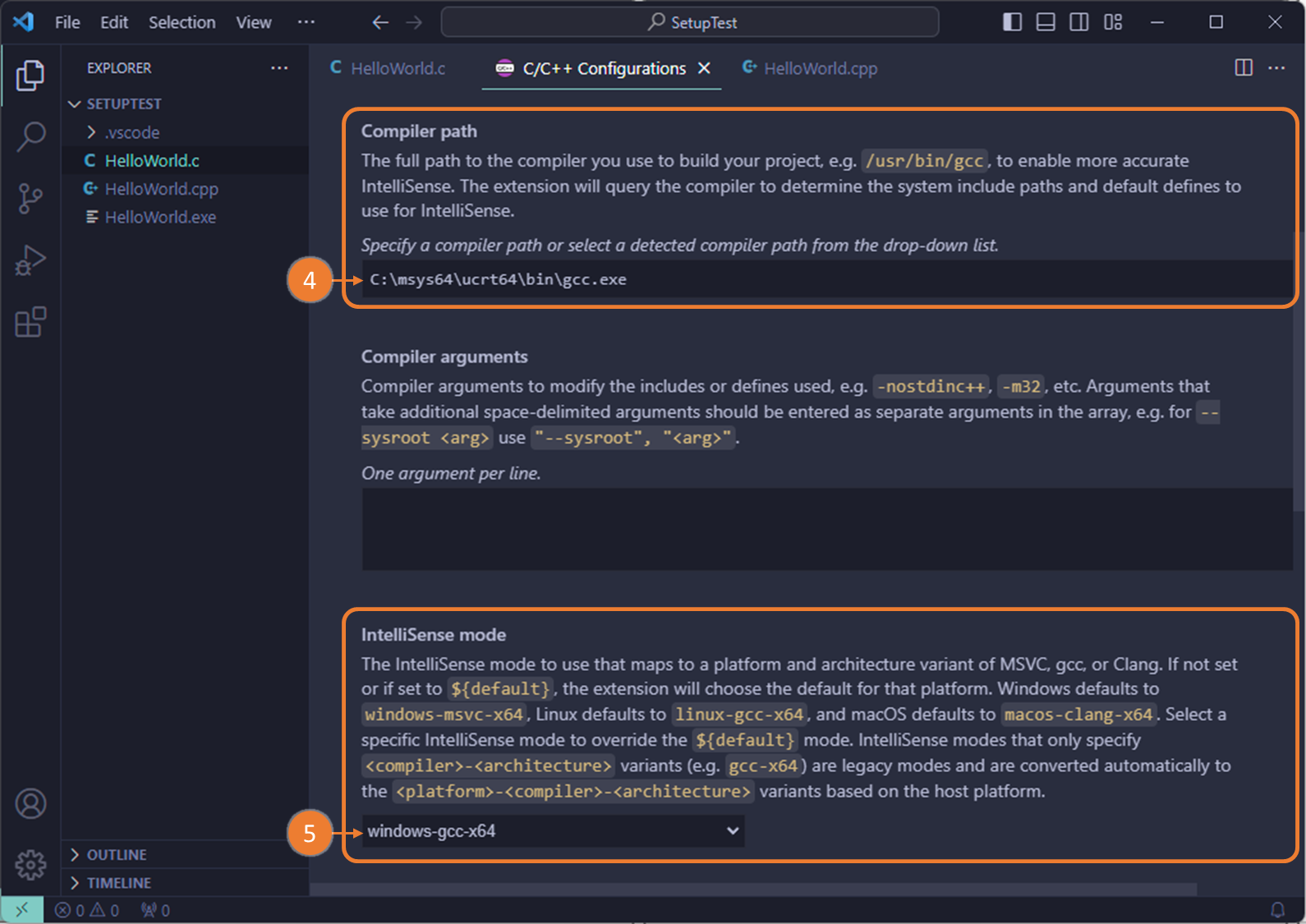 ④ 컴파일러 경로와 ⑤ IntelliSense 모드를 확인합니다.