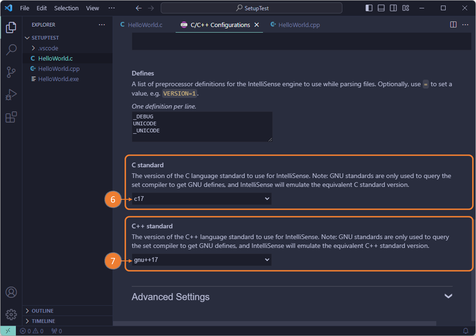⑥ 사용할 C 표준과 ⑦ C++ 표준을 선택합니다.