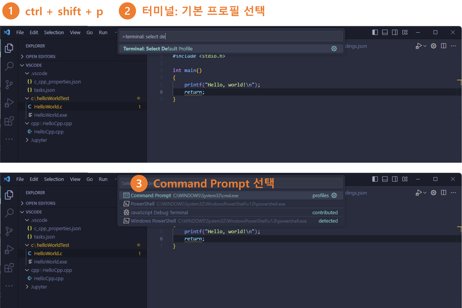 ① Ctrl + Shift + p 단축키를 눌러서 VS Code 명령어 팔렛을 활성화합니다.