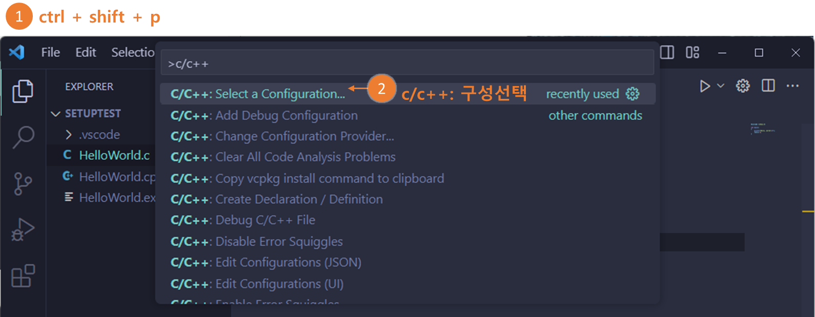 ② 아래 키워드로 검색하여 < C/C++: 구성 편집(UI) > 을 찾아 선택합니다.