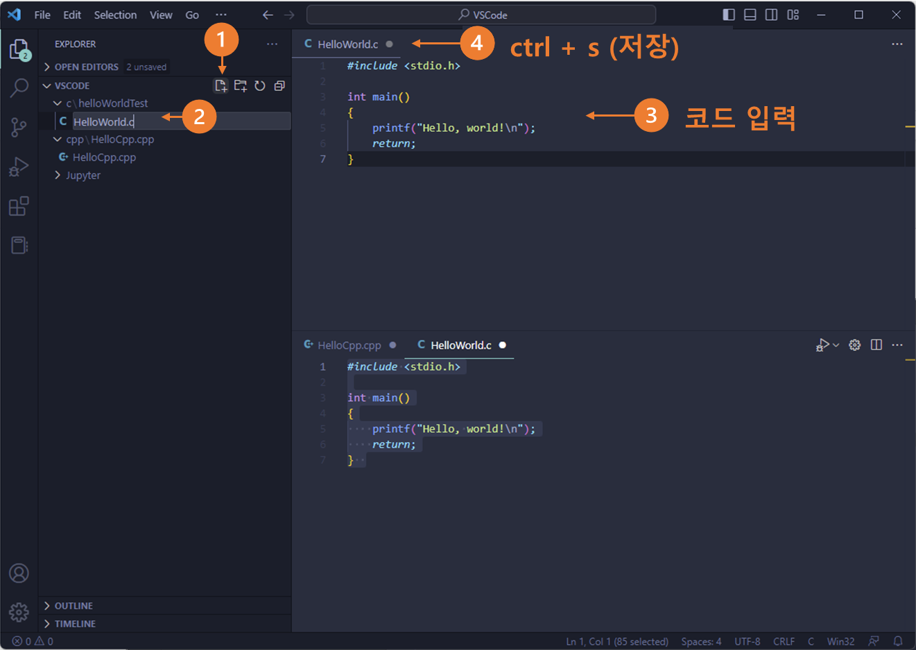 그리고 간단한 프로그램 C/C++ 소스코드를 작성하고, 컴파일, 실행, 디버깅 합니다.