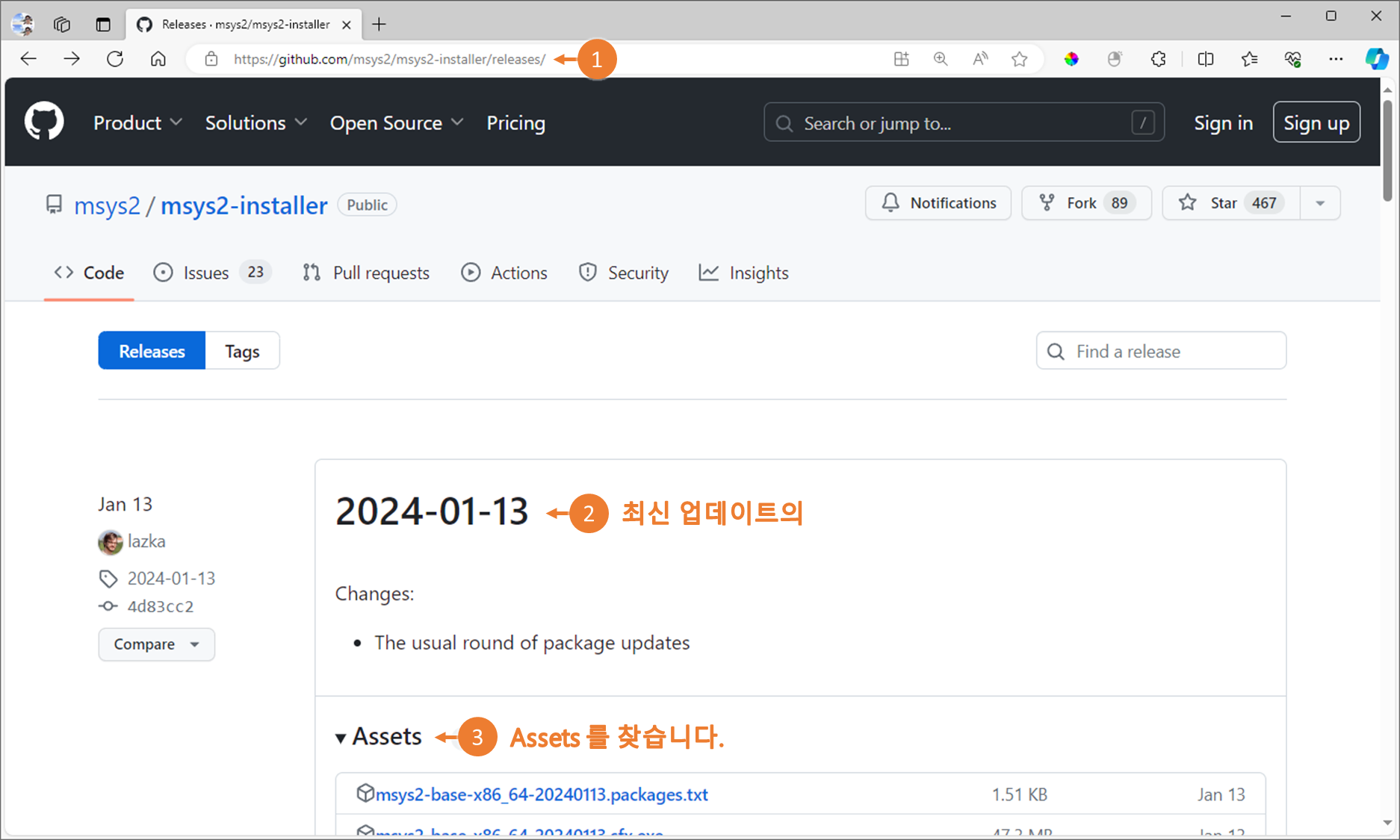 ①링크에서 ②최신 업데이트의 ③ Assets▼을 찾습니다.