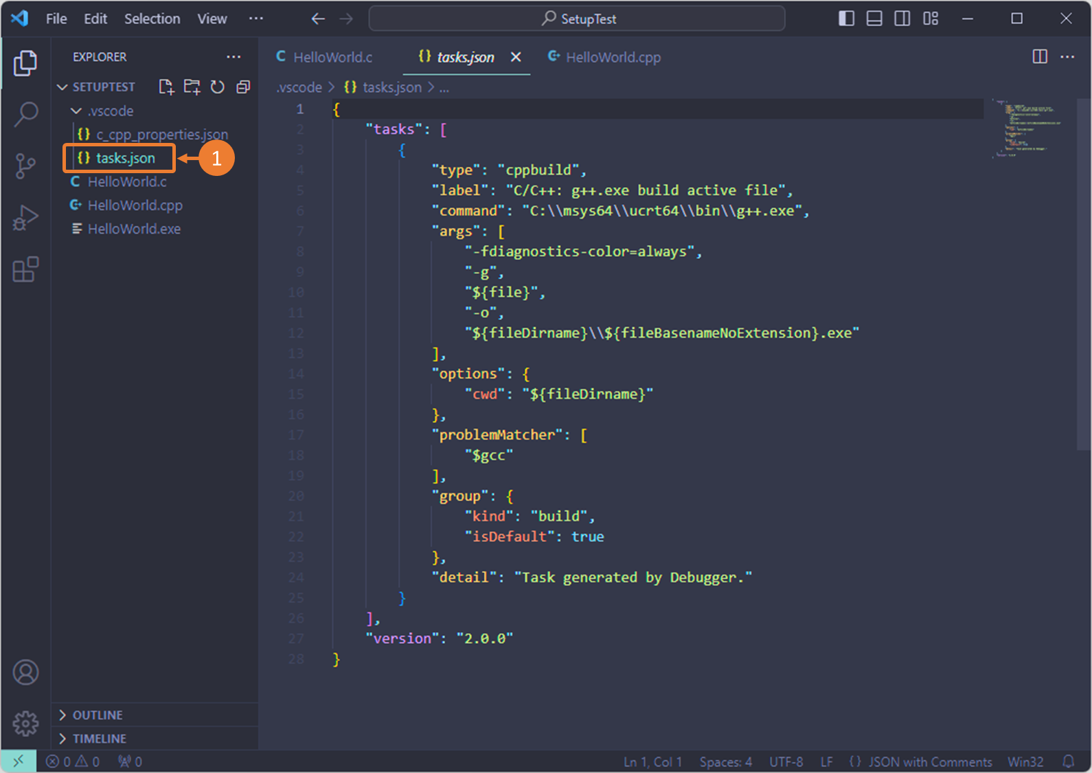 이전 단계에서 테스트 코드를 빌드 했다면, 아래처럼 tasks.json 파일이 기본값으로 생성됩니다.