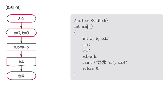 변수 a에 7을, 변수 b에 3을 저장하고, 변수 a 값에서 b 값을 뺀 결과를 출력하는 순서도와 C 프로그램을 작성하여라.