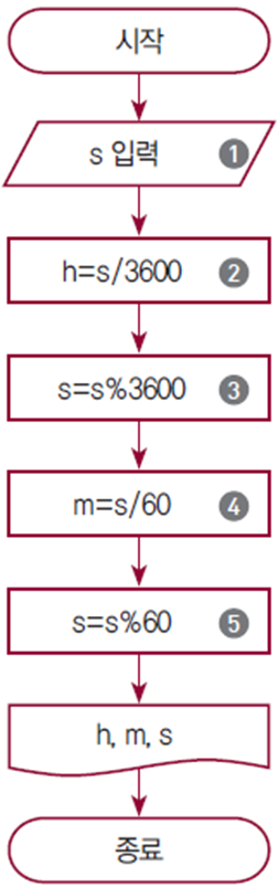 - s를 3600으로 나눈 몫을 h에 저장한다.