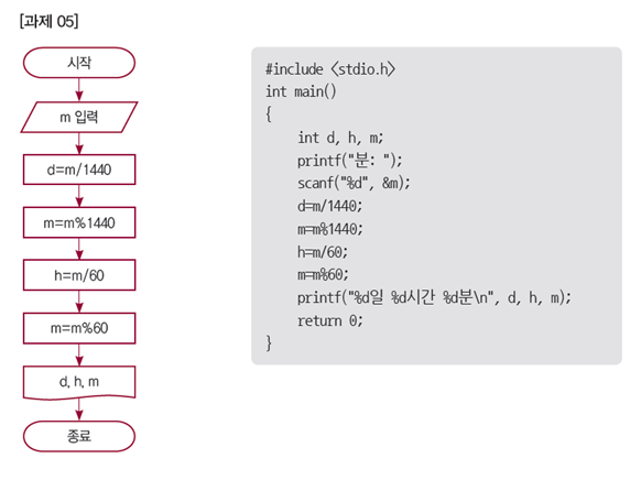 분 단위의 시간을 입력받아 일, 시간, 분으로 변환하여 출력하는 순서도와 C 프로그램을 작성하여라.