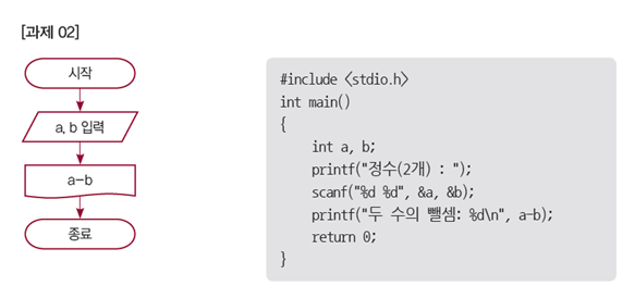 두 수를 입력 받아 뺄셈을 한 결과를 출력하는 순서도와 C 프로그램을 작성하여라.