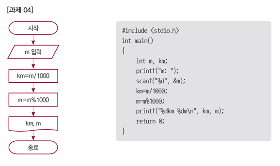 미터 단위의 길이를 입력받아 킬로미터와 미터로 변환하여 출력하는 순서도와 C 프로그램을 작성하여라.