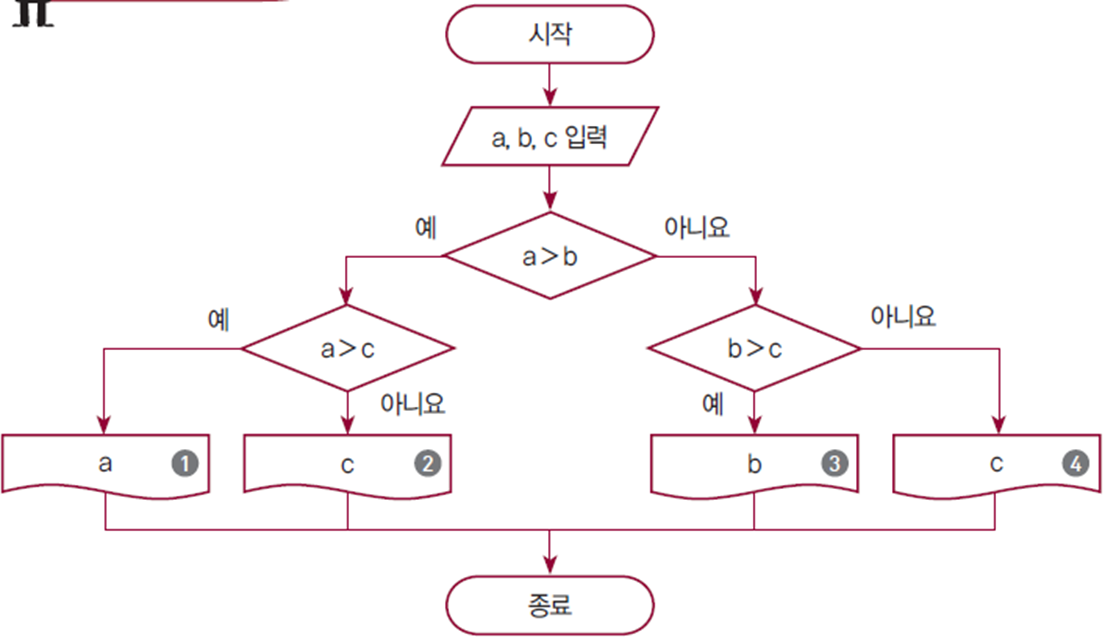a가 b보다 크고 a가 c보다 크면 a가 가장 큰 수가 되고, a가 b보다 크고 a가 c보다 크지않으면 c가 가장 큰 수가 된다. a가 b보다 크지 않고 b가 c보다 크면 b가 가장 큰 수가 되고, a가 b보다 크지 않고 b가 c보다 크지 않으면 c가 가장 큰 수가 된다.