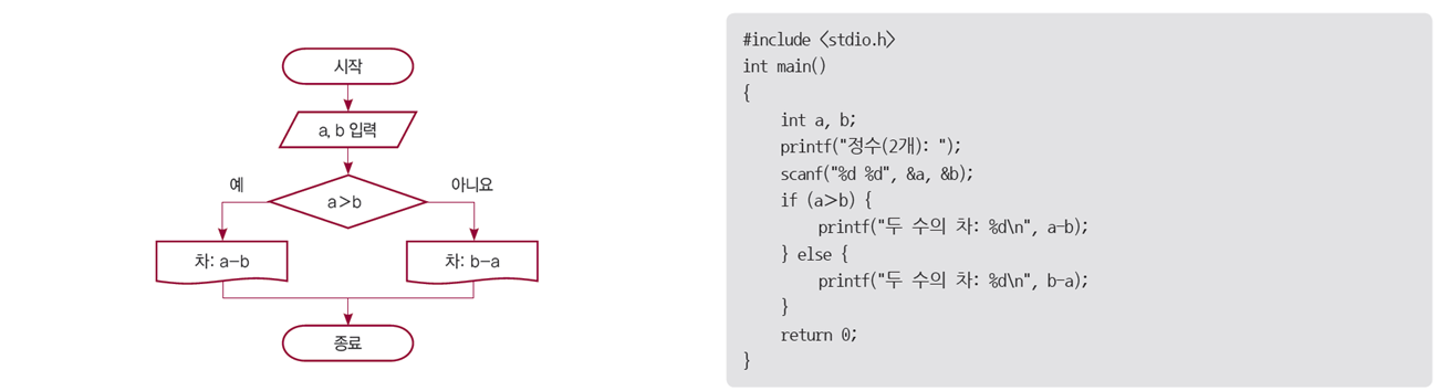 두 수를 입력받아 두 수의 차를 출력하는 순서도와 C 프로그램을 작성하여라.
