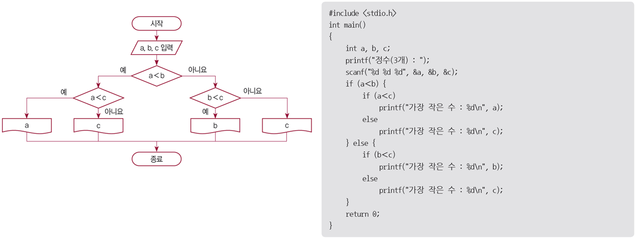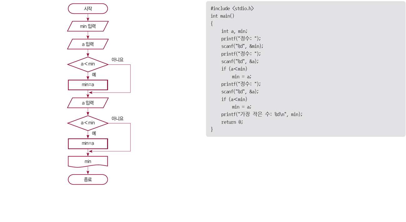 세 수를 입력받아 가장 작은 수를 출력하는 순서도와 C 프로그램을 작성하여라.