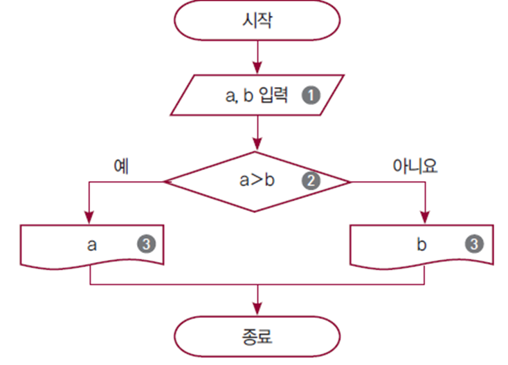 사용자로부터 입력 받은 두 수를 변수 a, b에 저장하고, a 값이 b 값보다 크면 a 값을 출력하고, 그렇지 않으면 b 값을 출력한다.