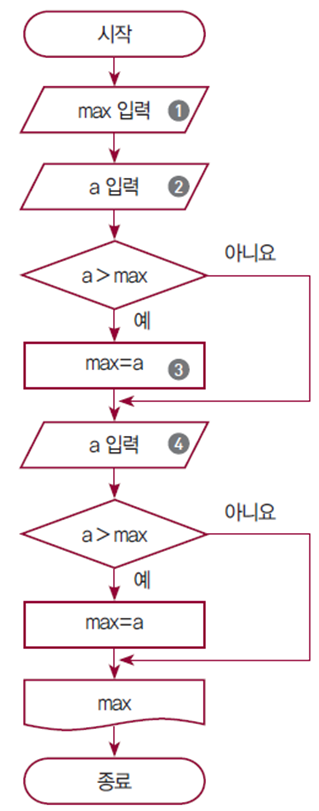 사용자로부터 첫 번째 수를 입력받아 max에 저장한다. 두 번째로 입력받은 수 a와 max를 비교하여 a가 max보다 크면 max에 a를 저장한다. 세 번째 수도 마찬가지 방법으로 수행한다. 결국 가장 큰 수가 max에 저장된다.