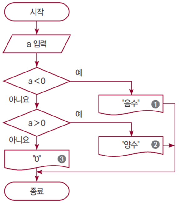 사용자로부터 입력 받은 수를 변수 a에 저장하고, a가 0보다 작으면 “음수”를, 그렇지 않고 0보다 크면 “양수”를, 그렇지 않으면 “0”을 출력한다.