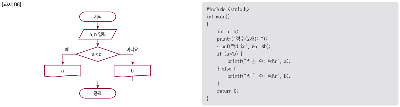두 수를 입력받아 둘 중 작은 수를 출력하는 순서도와 C 프로그램을 작성하여라.