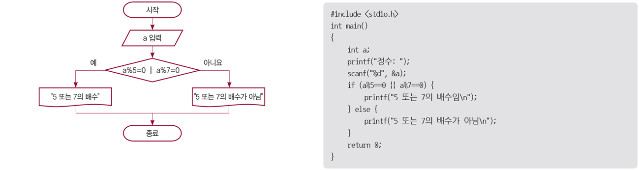 하나의 수를 입력받아 5 또는 7의 배수인지 판별하는 순서도와 C 프로그램을 작성하여라.