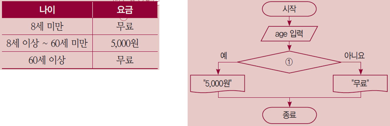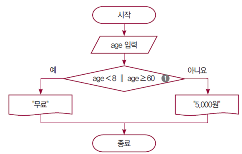 입력 받은 나이가 8미만이거나 60세 이상 이면 “무료”를 출력하고, 그렇지 않으면 “5,000원”을 출력한다.