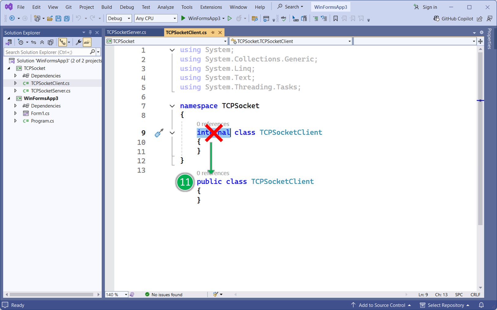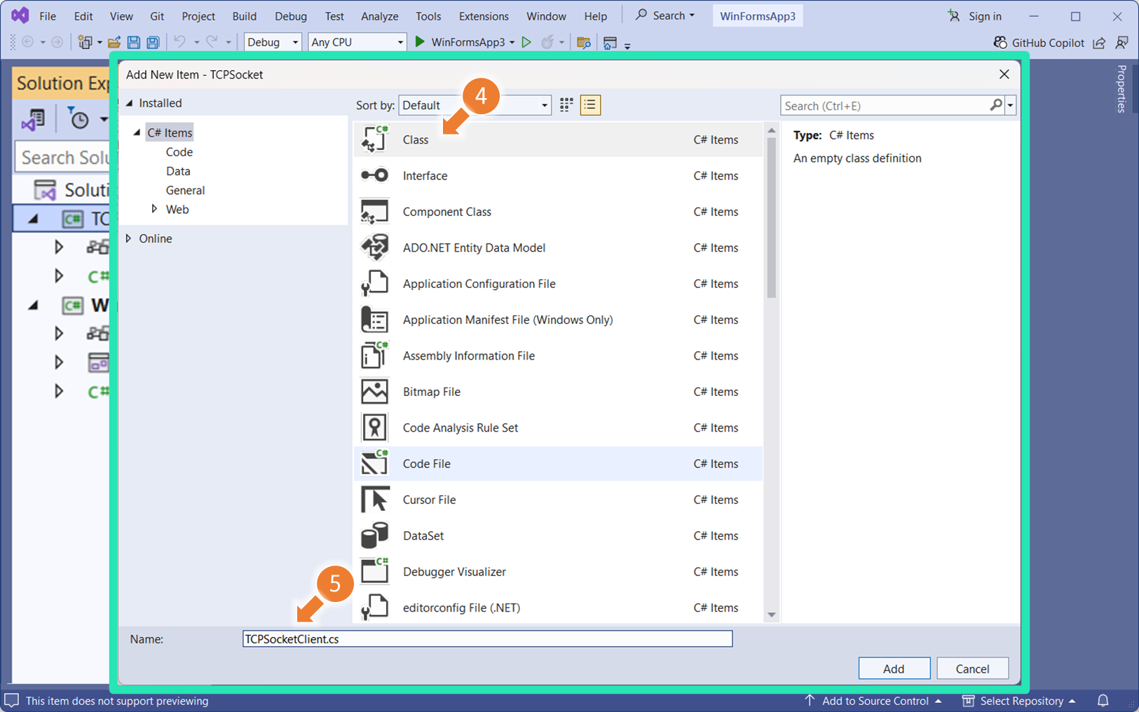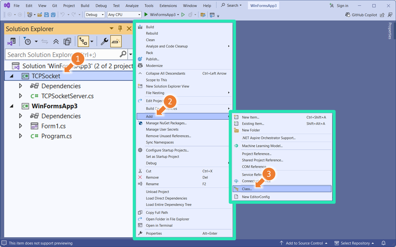 프로젝트에 클래스 파일 추가하기 2023.02.24 09:38 C# - WPF/Network 클래스 라이브러리에, 새 클래스 파일 추가 새 클래스 파일명을 변경(클라이언트) 생성한 클래스의 접근제어자를 알맞게 변경 공유하기 게시글 관리 BasicLike 댓글 공유하기 다른 글 댓글 이 글 공유하기 구독하기 구독하기 카카오톡 카카오톡 라인 라인 트위터 트위터 Facebook Facebook 카카오스토리 카카오스토리 밴드 밴드 네이버 블로그 네이버 블로그 Pocket Pocket Evernote Evernote 다른 글 Visual Studio C# 콘솔 프로젝트 생성하기 Visual Studio C# 콘솔 프로젝트 생성하기 2023.03.20 외부 프로젝트 솔루션에 추가하기 외부 프로젝트 솔루션에 추가하기 2023.03.20 Visual Studio C# 윈폼 프로젝트 생성하기 Visual Studio C# 윈폼 프로젝트 생성하기 2023.03.07 C# 클래스 라이브러리 생성하기 C# 클래스 라이브러리 생성하기 2023.03.04 다른 글 더 둘러보기