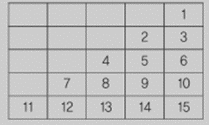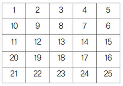 5행 5열 배열에 위와 같이 ‘ㄹ’자 모양으로 값을 저장하는 방법은 다음과 같다.