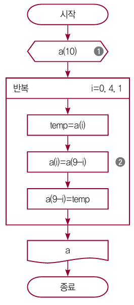i가 0부터 1씩 증가하며 4가 될 때까지 반복하며 a(i)와 a(9-i)를 교환한다.