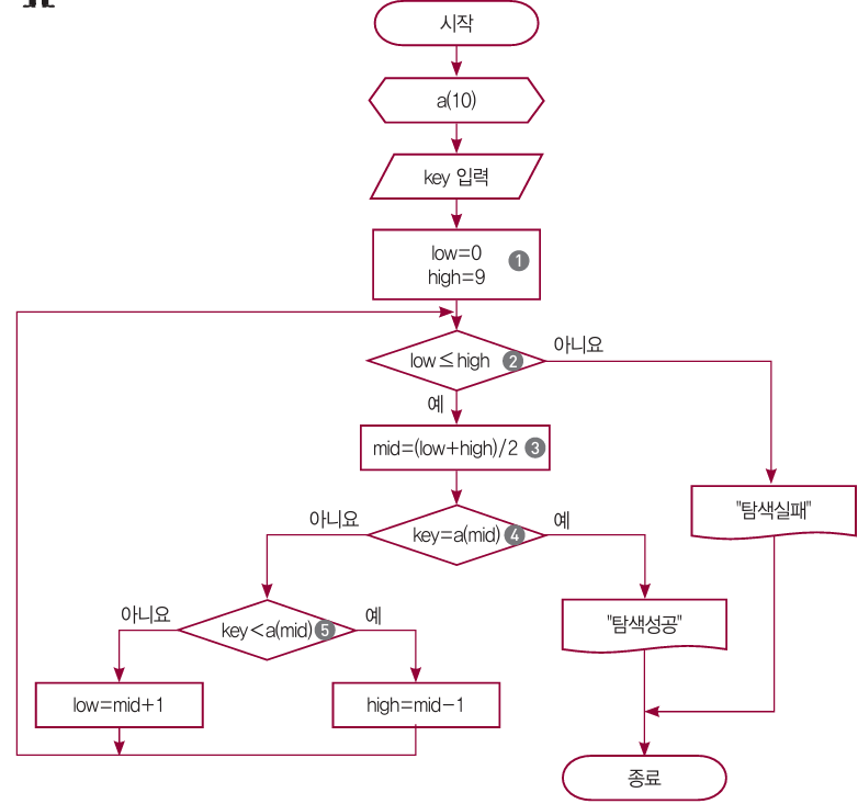 내림차순 데이터 집합에 대한 이진 탐색을 하는 순서도와 C 프로그램 을 작성하여라