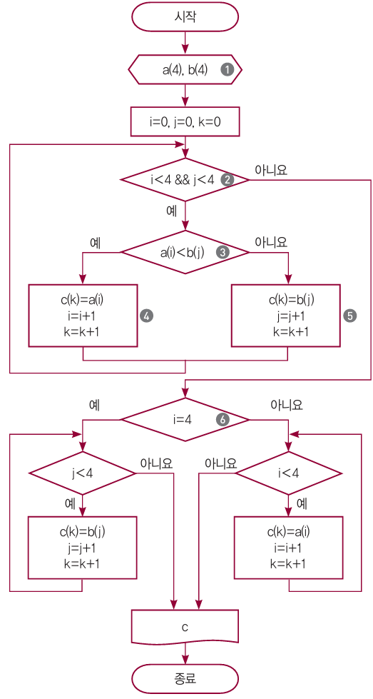 - b(j)를 c(k)에 저장하고 j 값과 k 값을 1 증가시킨다.