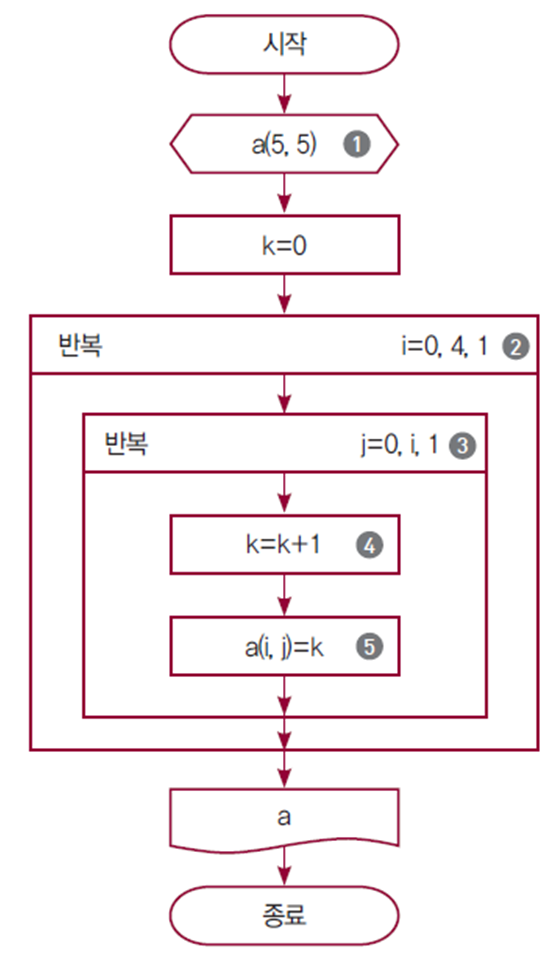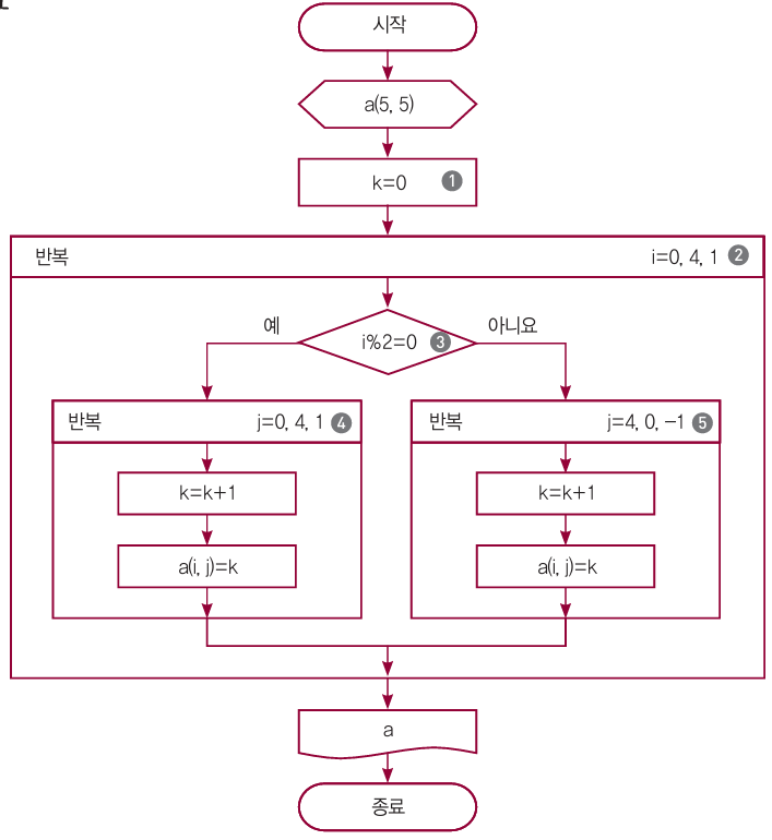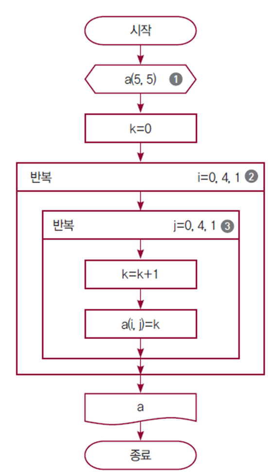 5행 5열 배열에 다음과 같이 저장한 후 출력하는 순서도와 C 프로그램 을 작성하여라.