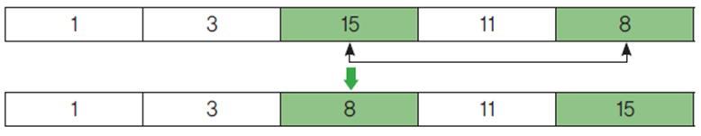 ④ 네 번째 데이터인 15와 마지막 데이터인 8의 위치를 바꾼다. 가장 큰 데이터인 15가 가장 뒤에 위치하게 된다