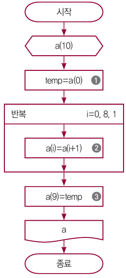 배열 요소를 오른쪽으로 한 칸씩 원형으로 이동하는 순서도와 C 프로 그램을 작성하여라.