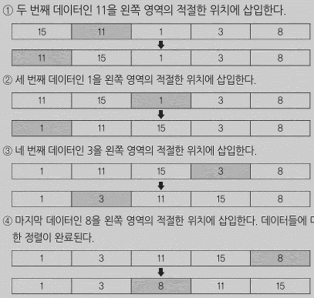 ③ 마찬가지 방식을 적용해 세 번째 데이터인 15와 네 번째 데이터인 3의 위치를 바꾼다.