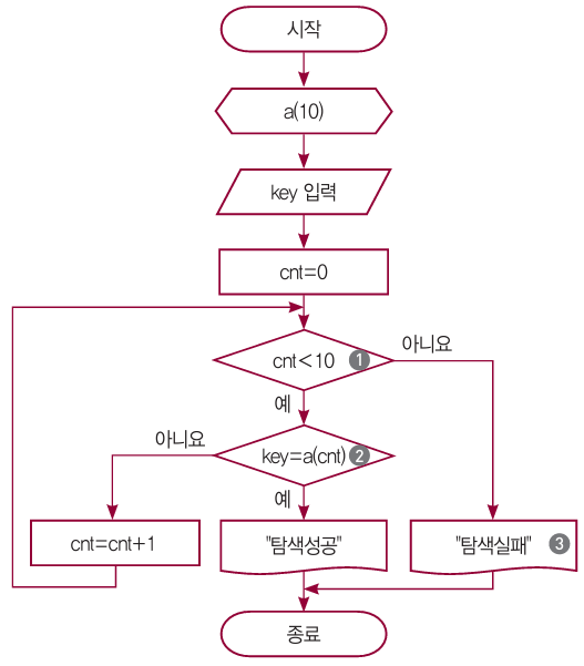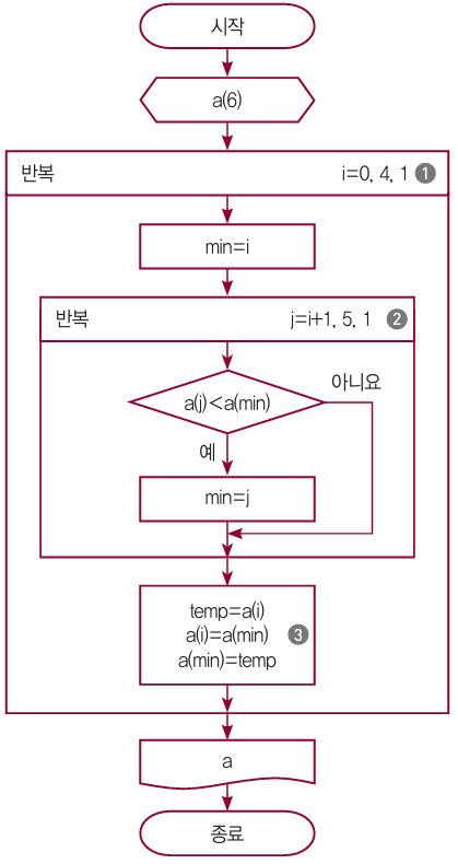 임의의 10개의 수를 저장하고 있는 배열에서 최솟값을 구하는 순서도 와 C 프로그램을 작성하여라