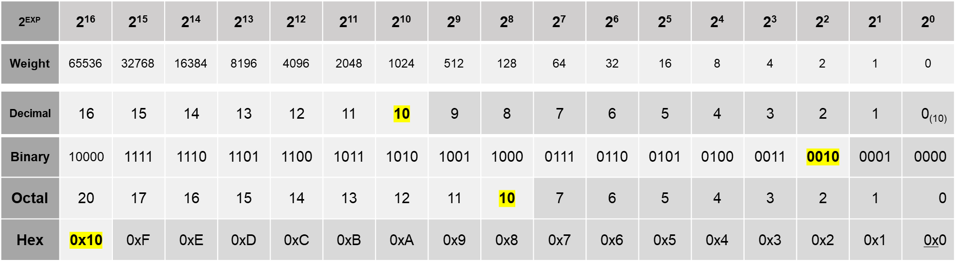 컴퓨터에서 많이 사용되는 10진수, 2진수, 8진수 16진수의 관계를 표로 나타내면 다음과같다.