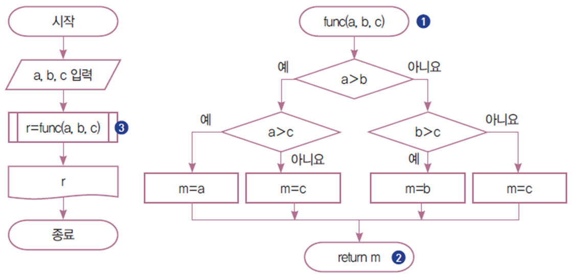 함수를 이용해서 두 수중 작은 수를 찾는 순서도와 C 프로그램을 작성하여라.