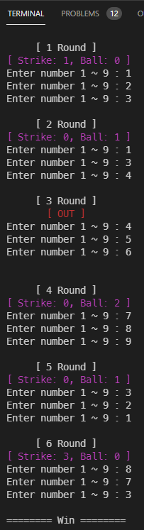 입력 후 결과에 대해 strike, ball, out 을 출력합니다.
