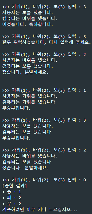 - 사용자가 0 이하의 값을 입력하면 최종적으로 승수, 무승부수, 패수를 출력하고 프로그램을 종료한다.