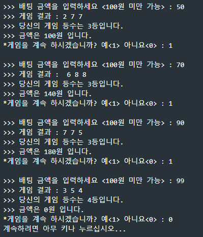 - main 함수에서는 InputMoney 함수와 Run 함수를 사용하여 슬롯머신 게임을 수행하며