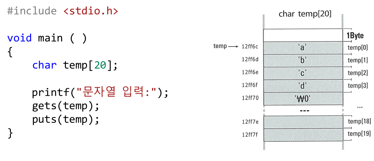 그렇기 때문에, 문자열 입력은 연속되는 문자 데이터의 마지막에 널문자가 추가된다.
