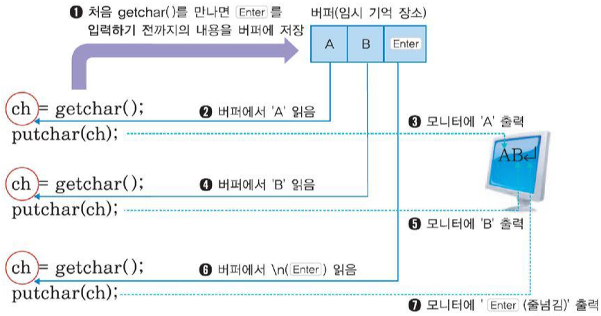 - 문자 하나를 입출력할때 사용하는 함수다.