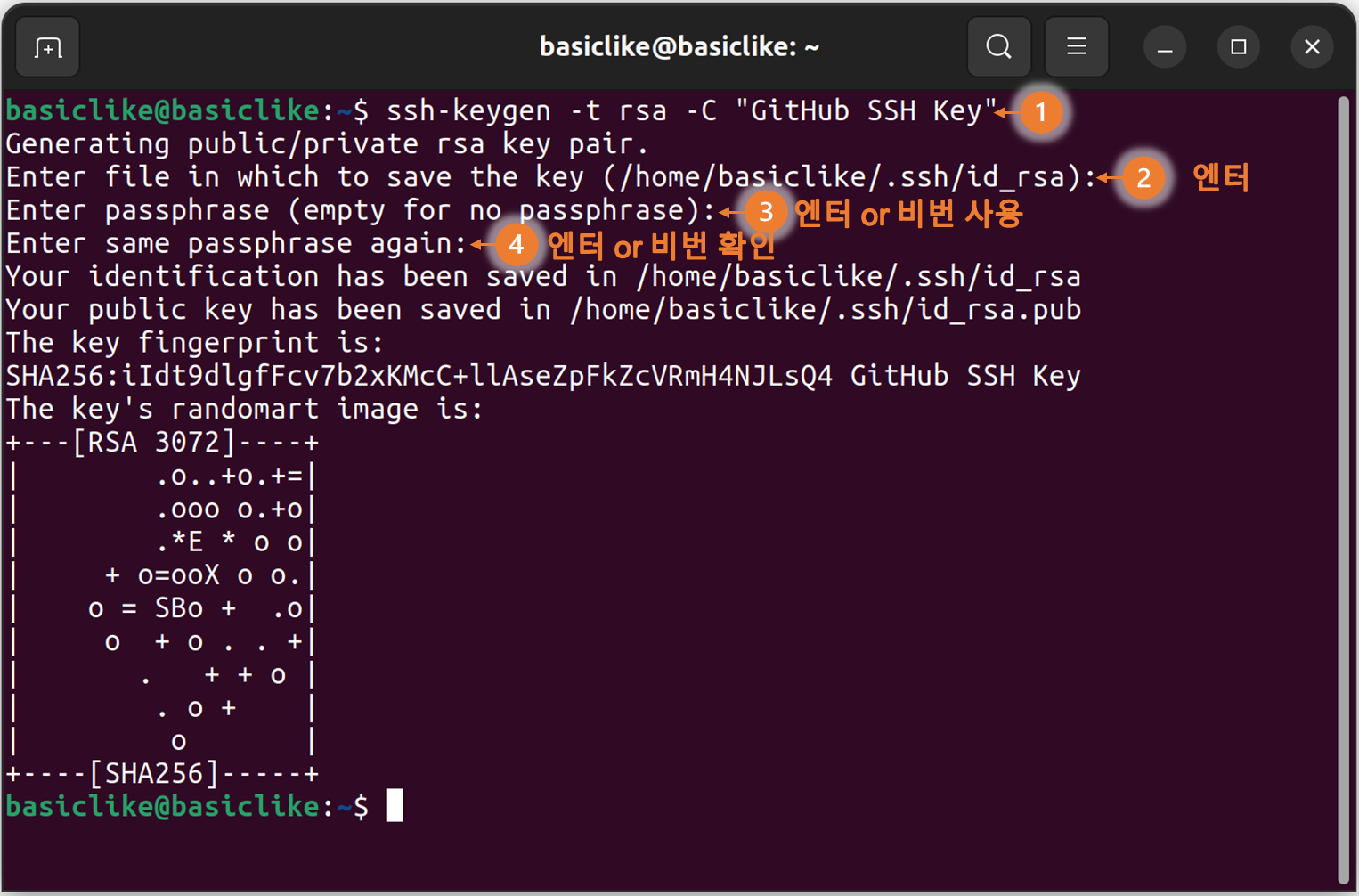 ssh-keygen -t rsa -C "코멘트, id@github.com"
