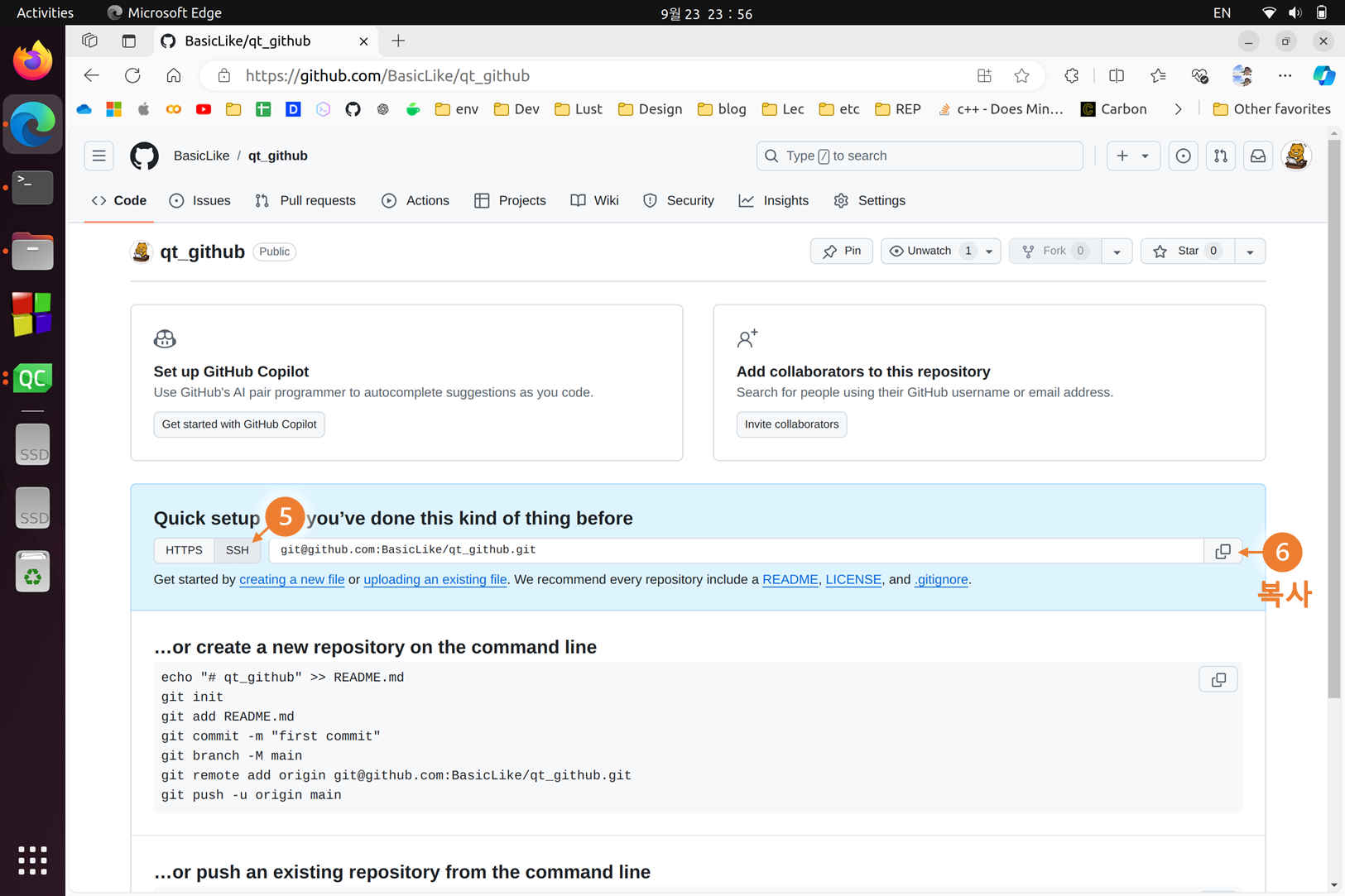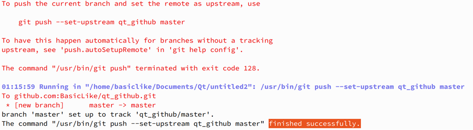 Qt 터미널에서 아래 git 명령어를 사용해, 원격저장소에 대한 브랜치를 연결해준다.