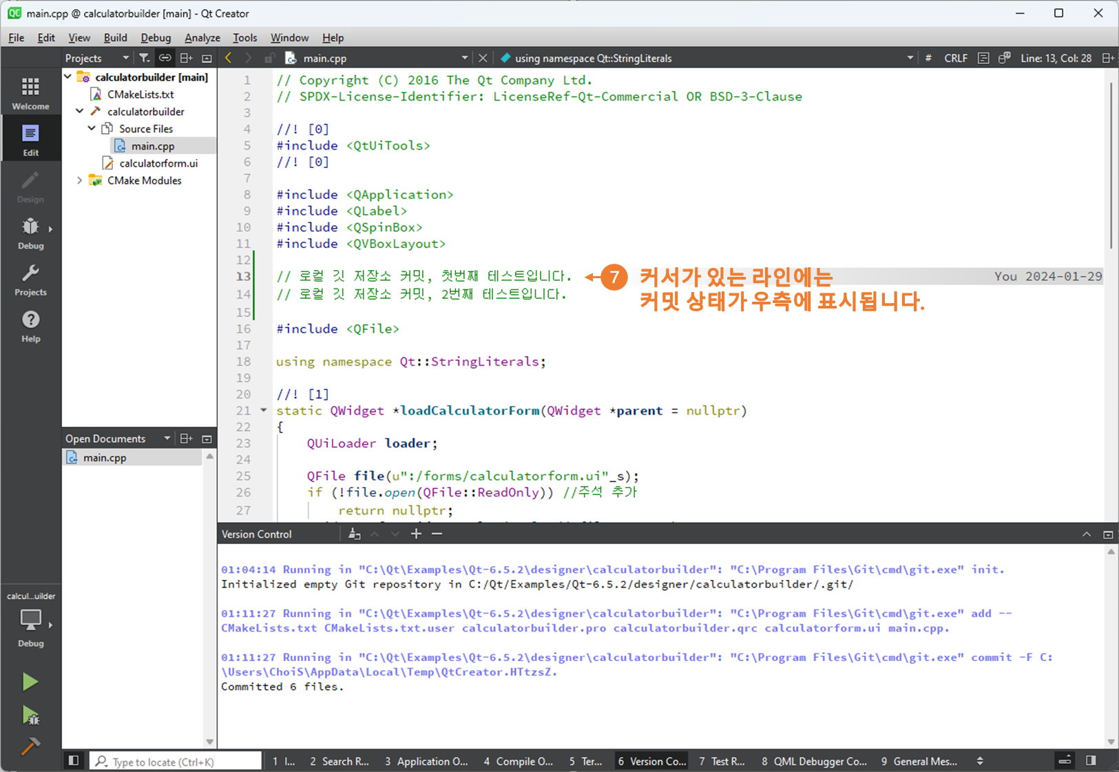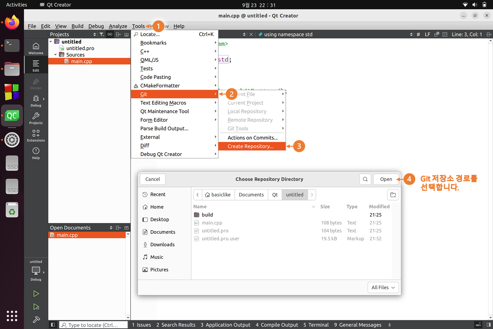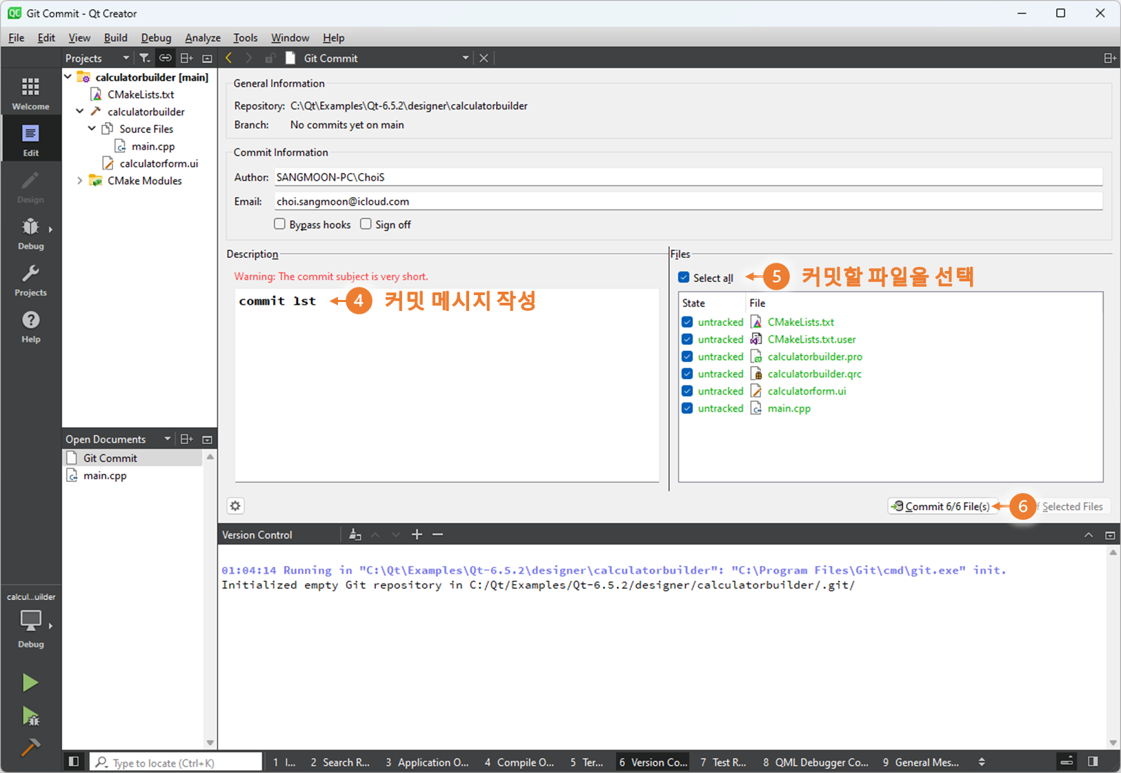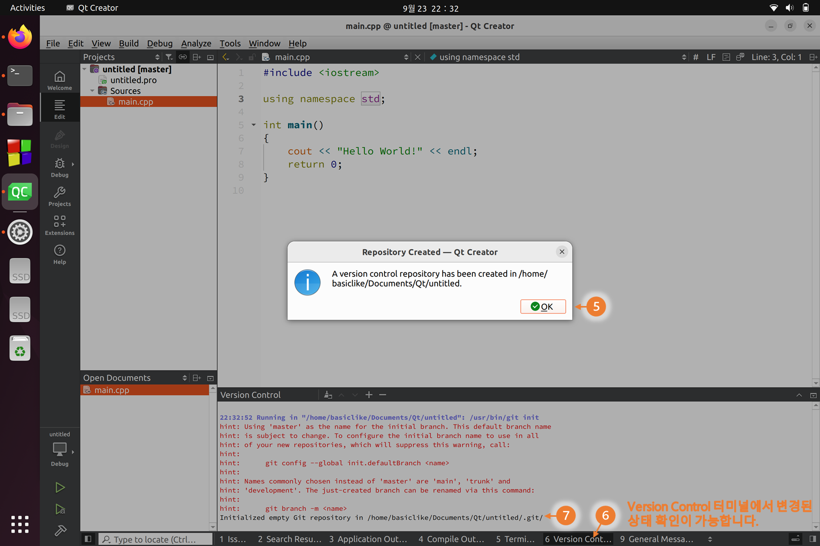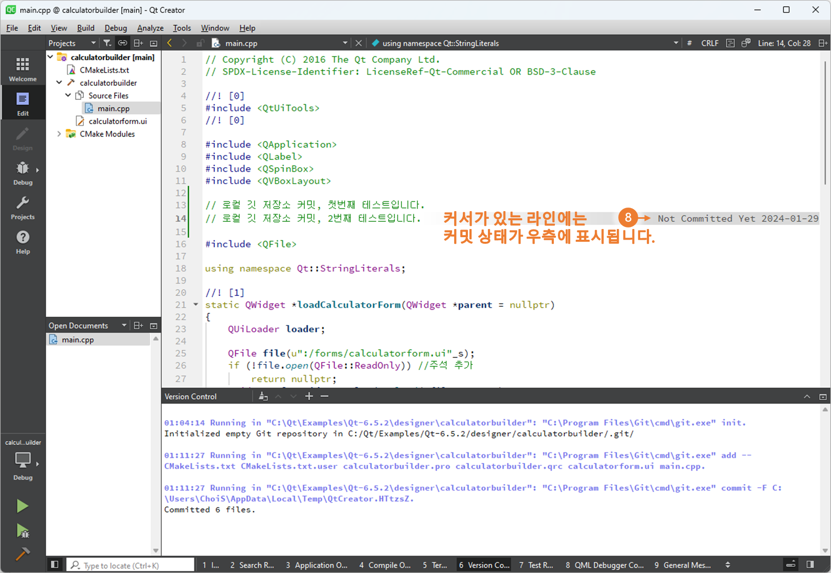 Qt Creator 에서, 프로젝트 변경 사항을 Git이 추적하도록, 프로젝트 경로에 로컬 Git 저장소를 생성합니다.