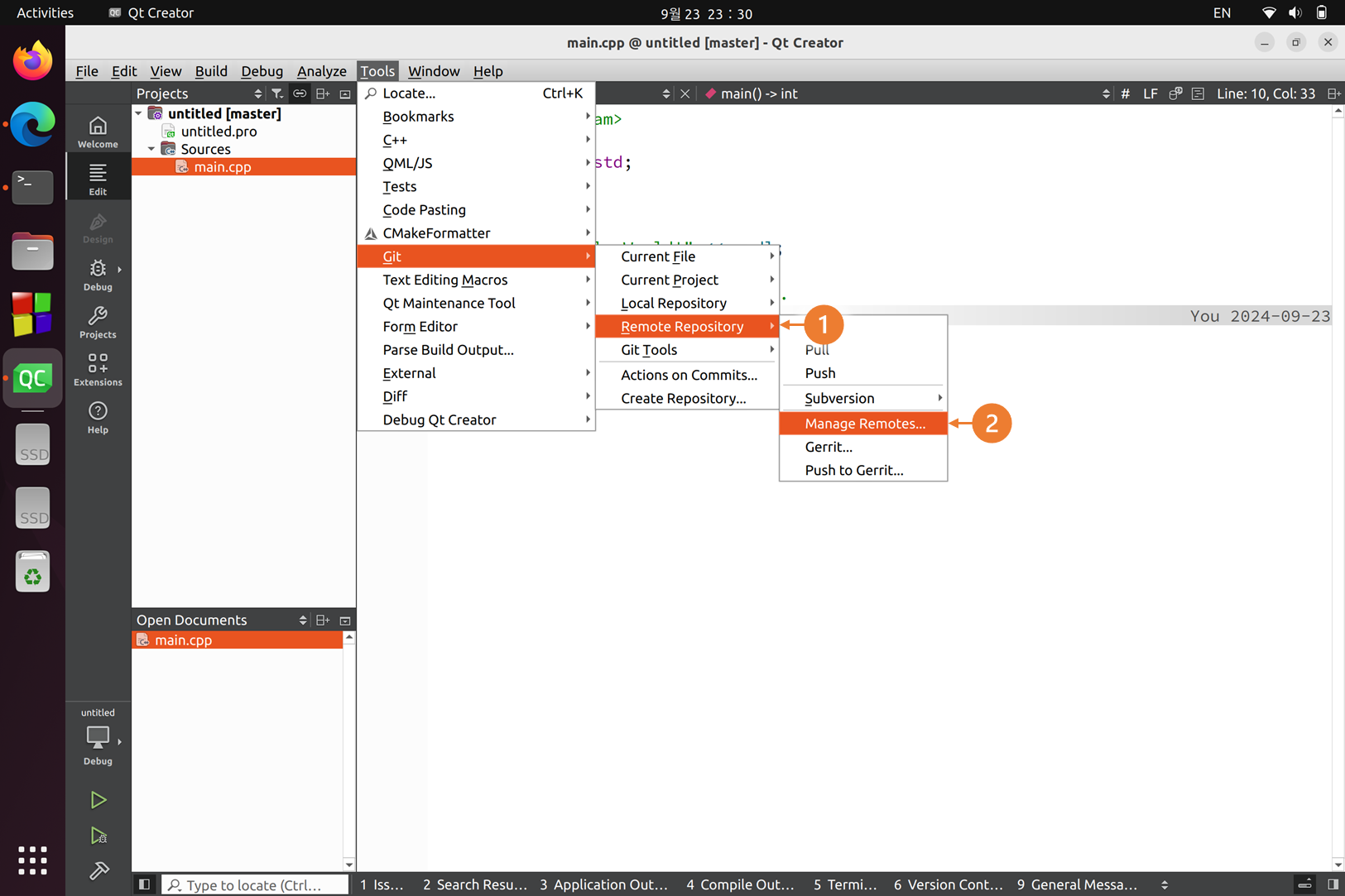 아래 이미지 처럼 Qt Creator 의 Tools 메뉴에서 Git 메뉴가 보이지 않는다면, 우분투에 Git 설치를 먼저 진행합니다.