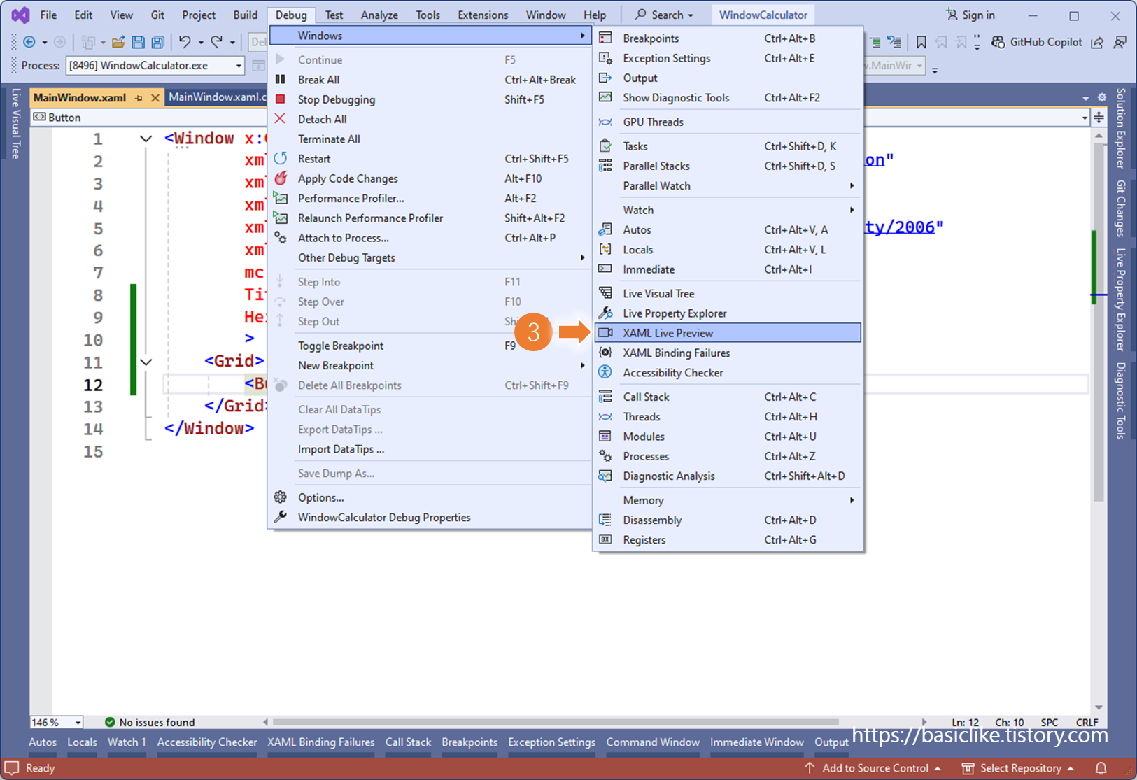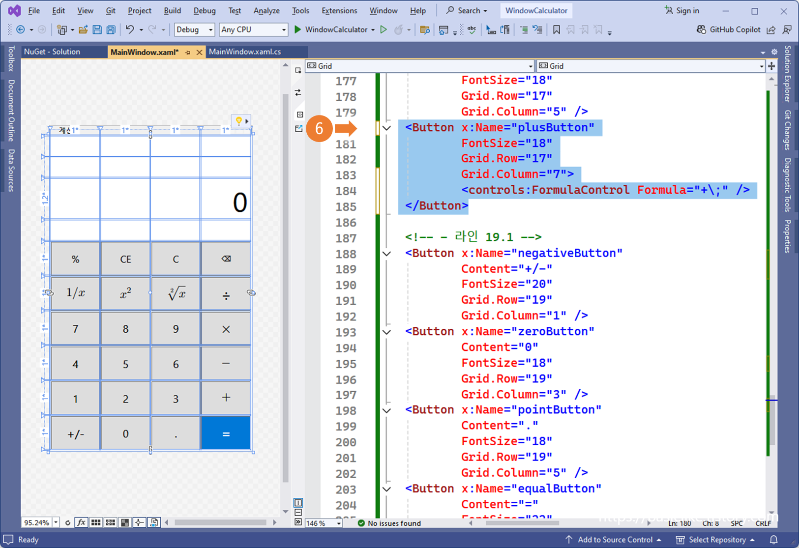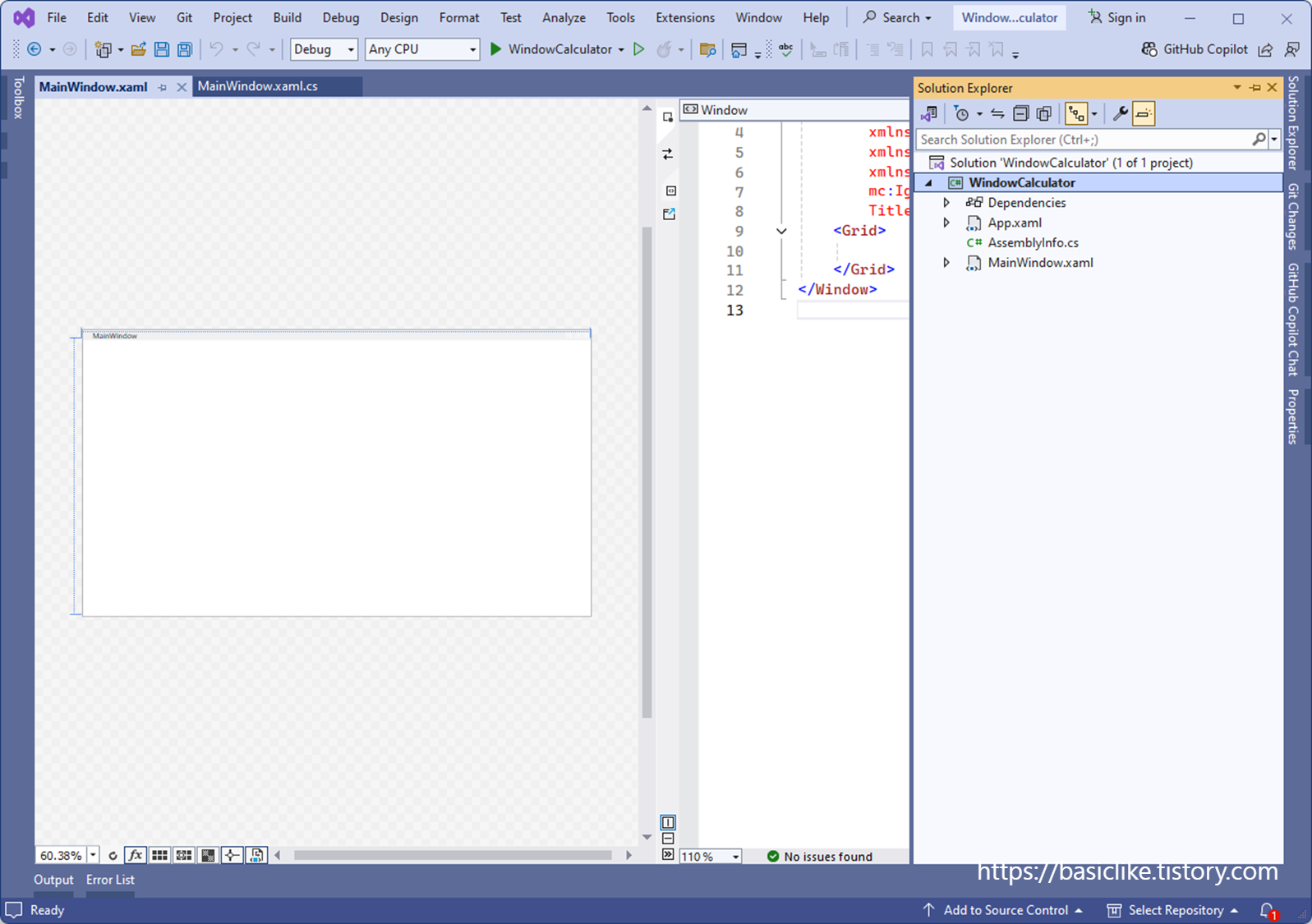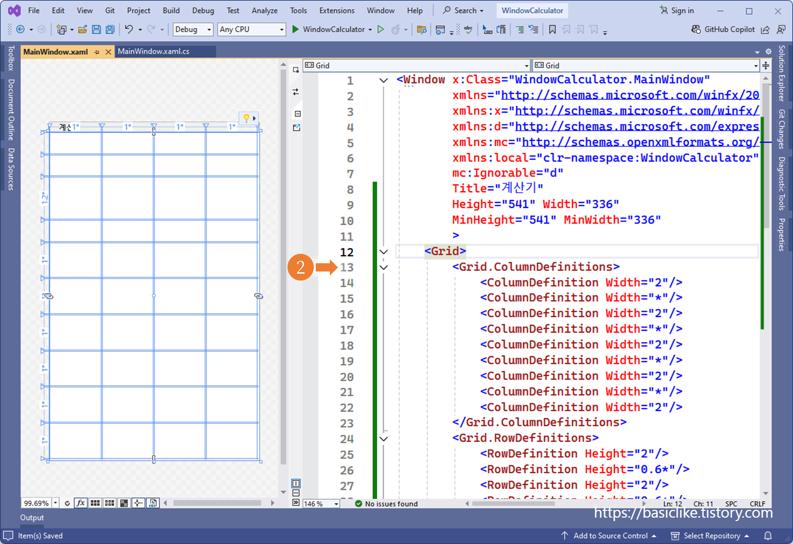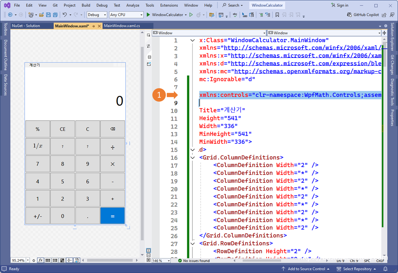 ❶ README에서 확인한 것처럼 XAML 디자이너의 상단의 Window 태그에 추가 설치한 패키지를 참조시켜 줍니다.